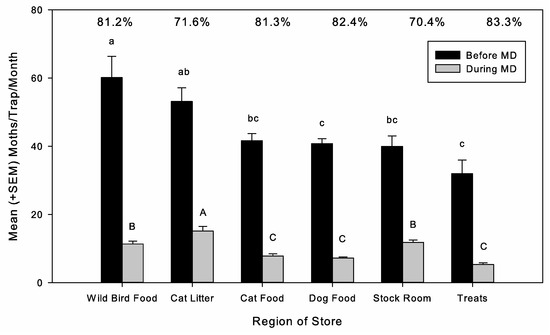 Plodia interpunctella captures in pheromone-baited traps per one-month monitoring period (mean + SEM) in retail pet stores prior to starting mating disruption (MD) (black bars) and during MD treatment (gray bars) for different regions in the stores; bars of the same color with the same letters did not have significantly different means (p < 0.05), and the percentages shown at the top of the graph represent the percentage reduction in moth captures between before and during MD.