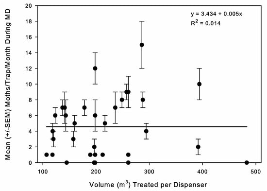 Correlation between Plodia interpunctella captures in pheromone-baited traps per one-month monitoring period (mean ± SEM) in retail pet stores during mating disruption (MD) and the volume of space treated per MD dispenser.