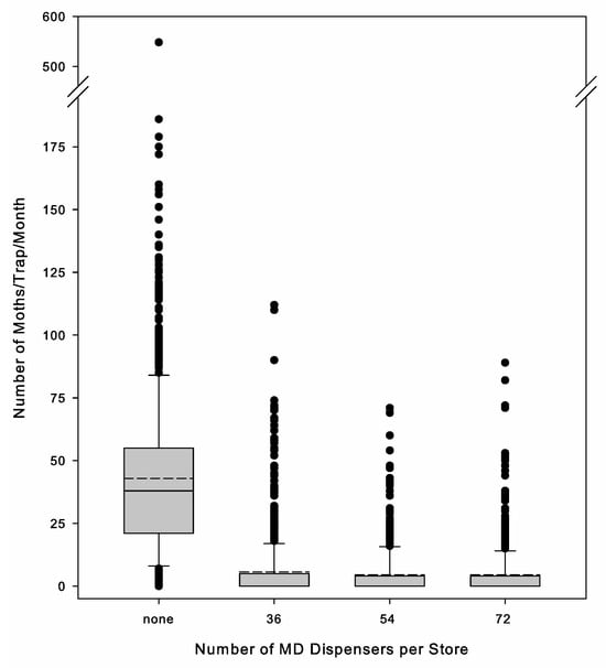 Box plots of Plodia interpunctella captures in pheromone-baited traps per one-month monitoring period prior to starting MD (none) and with 36, 54, and 72 mating disruption (MD) dispensers (representing low, medium, and high treatments): gray box represents data between the 25th and 75th percentiles, vertical capped lines (i.e., whiskers) represent data between the 5th and 95th percentiles, black dots represent data outside of the 5th and 95th percentiles, solid line in gray box indicates the median (50th percentile), and dashed line indicates the mean.