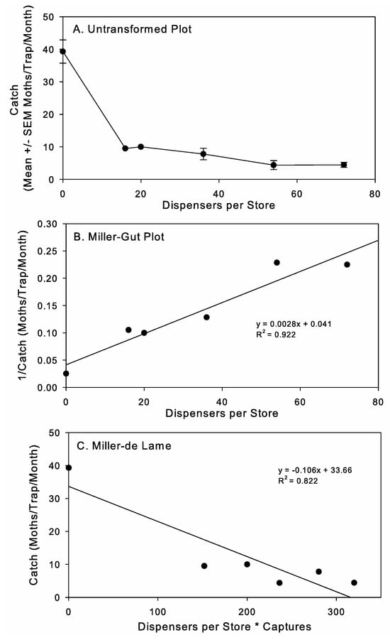 The plots of moth capture and dispenser number were consistent with relationships expected for competitive MD mechanisms as described in Miller et al. [26] using simulated data (Figure 7). The plot of the untransformed data (Figure 7A) was curvilinear, which resembles the profile for competitive attraction in Miller et al.’s study [26]. The initial steep drop in captures had leveled off by the lowest dispenser density tested, suggesting that even lower dispenser densities might still provide suppression. The Miller–Gut plot (Figure 7B) fit a linear function with a positive slope, which is consistent with competitive attraction mechanisms as opposed to a more concave pattern predicted with non-competitive mechanisms. The Miller–de Lame plot (Figure 7C) was also consistent with competitive attraction, since there was a good fit to the linear model, even with the large gap in data at low dispensers/store * moth capture values, and there was no evidence of a recurve in the data plot that would be expected for situations with non-competitive mechanisms [26]. Only monitoring data from periods of time when single dispensers were used in stores were included in this analysis, not the data using MESO dispensers, to facilitate the evaluation dispenser density on the ability of male moths to find traps.