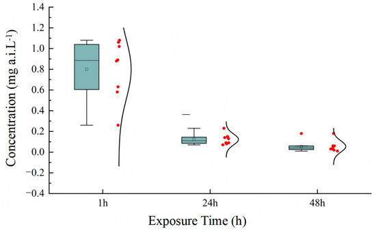 In the acute toxicity tests, LC50 values for acetamiprid in active ingredient were calculated separately for each of the eight tests performed. The results are presented as box plots in Figure 1. The complete statistical parameters for all toxicity tests (LC50 values with 95% CIs, slopes ± SE, and χ2 values) are provided in Supplementary Table S1. The mortality in both solvent and blank control did not exceed 15%. The LC50 values of acetamiprid for T. dendrolimi were 0.80, 0.12, and 0.06 mg a.i. L−1 after different exposure times. The results also indicate that the endpoint of toxicity decreased with the increase in exposure time. The risk assessment results showed that acetamiprid was slight to moderately toxic to T. dendrolimi.