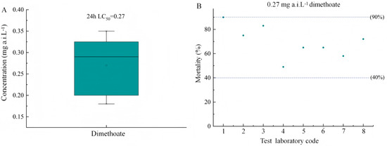 The toxicity of reference item dimethoate to T. dendrolimi: (A) the 24 h LC50 mean values of dimethoate after the egg parasitoid was exposed to dimethoate; (B) mean mortality (±SE) of T. dendrolimi adults exposed to dimethoate at 0.27 mg a.i. L−1 (n = 8 replicates). The number on the x-axis refers to eight different toxicity tests conducted on Trichogramma dendrolimi using dimethoate as a reference insecticide.