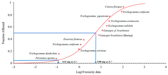 In addition, according to the maximum exposure concentration (100 mg a.i. L−1), the potentially affected fraction (PAF) of species exposed to acetamiprid was 76.8%, which means that at this concentration, 76.8% of the parasitoids will be affected and the result indicated a certain risk to the ecosystem. By analyzing the SSD curves constructed for acetamiprid (Figure 5), the Peristenus spretus [41] appears to be among the most sensitive parasitic species for which toxicity data were available, followed by Trichogramma ostriniae [42], T. dendrolimi (this paper), Trichogramma confusum [42], Encarsia formosa [43], Ganaspis brasiliensis [36], Ganaspis cf. Brasiliensis [37], T. nubilale [44], T. evanescens [44], T. japonicum [45], T. ostriniae [46], T. confusum [47] and Cotesia flavipes [35].