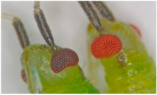 In 2022, a single female M. pygmaeus with bright red eyes (Figure 1) was observed. This female was used to establish a population of red-eyed M. pygmaeus. In insects, most mutations that alter eye color are recessive and usually involve a single gene [7]. No previous studies have documented populations of M. pygmaeus with bright red eyes. However, similar studies have been conducted on Orius sauteri and O. strigicollis (Heteroptera: Anthocoridae) and Lygus lineolaris (Hemiptera: Miridae) [8,9]. In both studies, it was concluded that the mutant red eye color was determined by a single autosomal recessive allele.