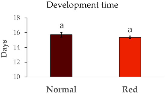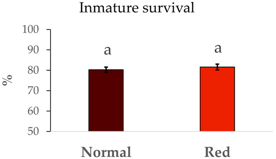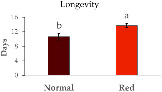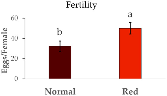 Differences in fertility were observed between the two populations. Females from the standard population laid approximately 32 N1 nymphs, consistent with the findings of Vanderkerkhove et al. [21], who reported an average of 32 eggs per female from a normal eye population. However, the red-eyed population exhibited higher fertility (50 N1/female) compared to our standard population. Fertility rates reported in other studies range from 45 to 80 N1 per female from a normal eye population [22,23]. There were also differences in female longevity between the standard and red-eyed populations. However, previous studies [23] reported longer longevity from a normal eye population, ranging from 48 to 50 days. While our population’s female longevity was between 10 and 14 days.