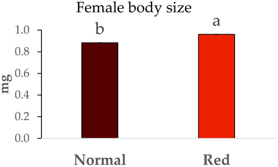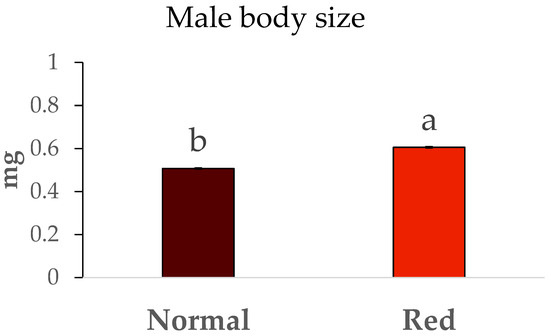 The weights of males and females from both studied populations are shown in Figure 4 and Figure 5. Significant differences were observed in the sizes of males between the two populations (F = 106.71, df = 1/7, p < 0.05), with the males from the red-eyed population being larger, exhibiting an average weight close to 0.6 mg. In contrast, the weights of males from the standard population were around 0.5 mg. The same trend was observed with the weights of females from both populations, as significant differences were also present (F = 6.62, df = 1/7, p < 0.05). Once again, the females from the red-eyed population were heavier (close to 1 mg) compared to those from the normal population (approximately 0.8 mg).