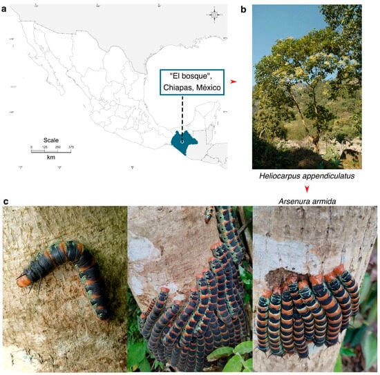The larvae and adults of A. armida were collected from a site known as “Los Angeles” located in the municipality of Bosque, Chiapas, Mexico (17°03′42′′ N, 92°43’16′′ W; 1227 m.a.s.l.) (Figure 1). This area is characterized by a temperate climate with frequent summer rainfall, an average annual precipitation of 1220 mm, and an average annual temperature of 18 °C. The soil is of the vertisol type, shallow, and slightly acidic (pH 6.2–6.6). The vegetation in this region is classified as a semi-evergreen tropical forest, which serves as the primary habitat for H. donnellsmithii, H. appendiculatus, and G. ulmifolia. These trees are the main hosts where the larvae of A. armida colonize and feed.