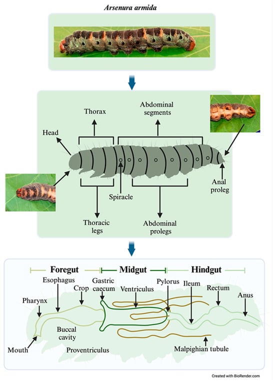 Arsenura armida, a member of the Lepidoptera order and Saturniidae family, was first described by Pieter Cramer in 1779. Its larval stage lasts 40–60 days, with individuals reaching 12–14 cm in length and displaying green, black, and yellow ring patterns that provide camouflage against predators [4,6,7,8]. Morphologically, larvae exhibit a segmented body with a head bearing sensory organs and mandibles, a thorax with three pairs of true legs, and an abdomen with four pairs of prolegs [9]. The digestive system comprises three regions: the foregut (FG), midgut (MG), and hindgut (HG). In some Lepidoptera, including Bombyx mori, the MG functions as a major digestive site due to its alkaline environment, facilitating nutrient absorption and the enzymatic breakdown of lignocellulosic material [6,10].