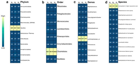 Heatmap of relative abundance (%) of bacterial taxa with values greater than 0.2%, based on 16S rRNA gene sequencing of biological triplicates. Taxonomic profiles are shown at four hierarchical levels: (a) Phylum, (b) Order, (c) Genus, and (d) Species. Columns represent replicates (R1, R2, and R3), and each cell shows the observed percentage of relative abundance for the corresponding taxon. Color intensity reflects abundance levels, with lighter shades indicating higher abundance.