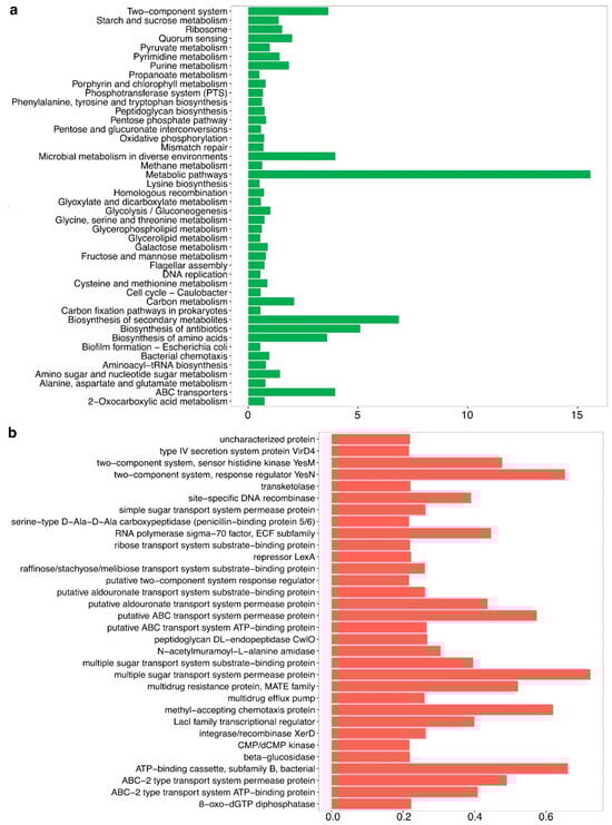 The analysis of orthologous genes (Figure 4b) revealed the presence of transport systems, multidrug resistance mechanisms, and stress response genes. Two-component regulatory systems, transcriptional regulators, and DNA recombinases were also identified. Additionally, genes encoding ABC transporters, multiple sugar transporters, and chemotaxis proteins were detected. Biosynthetic pathways for secondary metabolites and antibiotics were present as well.