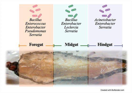 Although variability exists across taxa, the MG is often described as a primary digestive site in several Lepidopteran species, such as Bombyx mori and Helicoverpa armigera, housing microorganisms that may contribute to enzymatic digestion and the detoxification of plant metabolites [17,18,19]. These symbionts may enhance digestive efficiency and provide antimicrobial compounds that bolster immune defenses. For example, Bacillus, Enterobacter, and Pseudomonas have been identified as contributors to cellulose degradation and nutrient metabolism in Lepidopteran insects such as Helicoverpa armigera and Bombyx mori [18,19].