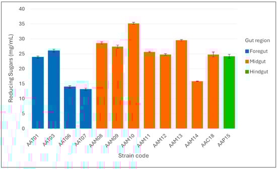 Reducing sugar production (mg/mL) by cellulolytic bacterial strains isolated from different gut regions (foregut, midgut, and hindgut) of Arsenura armida larvae. Bars represent the mean values ± standard deviation of triplicate measurements.