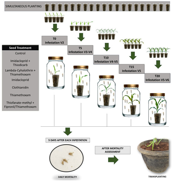 - Neves, T.N.C.; Josemar, F.; Silva, P.R.; Alves, E.; Rocha, R.; Oliveira, C.; Picanço, M.C.; Pereira, E.J.G. Insecticide seed treatment against corn leafhopper: Helping protect grain yield in critical plant growth stages. Pest Manag. Sci. 2021, 78, 1482–1491. [Google Scholar] [CrossRef]