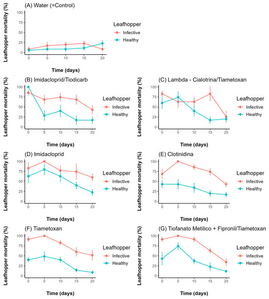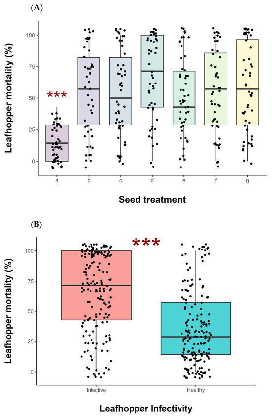 Redoan, A.C.M.; Marques, V.M.; Pereira, P.S.; de Oliveira, I.R.; Silva-Araújo, D.D.; Cota, L.V.; Fadini, M.A.M.; Oliveira, C.M.; Rafael, D.D.; Mendes, S. What Is the Relationship Between Efficacy of Seed Treatment with Insecticides Against Dalbulus maidis (Delong and Wolcott) (Hemiptera: Cicadellidae) Healthy and Infected with Spiroplasm in the Corn Stunt Control? Insects 2025, 16, 713. https://doi.org/10.3390/insects16070713