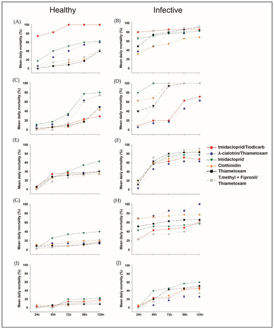 Chicago/Turabian StyleRedoan, Ana Carolina M., Vinicius M. Marques, Poliana S. Pereira, Ivênio R. de Oliveira, Dagma D. Silva-Araújo, Luciano V. Cota, Marcos Antonio M. Fadini, Charles M. Oliveira, Diego D. Rafael, and Simone Mendes. 2025. "What Is the Relationship Between Efficacy of Seed Treatment with Insecticides Against Dalbulus maidis (Delong and Wolcott) (Hemiptera: Cicadellidae) Healthy and Infected with Spiroplasm in the Corn Stunt Control?" Insects 16, no. 7: 713. https://doi.org/10.3390/insects16070713