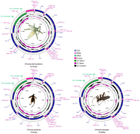 Mitogenome map of Chionea tianhuashana, Chionea sphaerae and Chionea crassipes. The outermost ring displays features encoded by the positive strand, while the adjacent ring corresponds to the negative strand. tRNAs are annotated using standard abbreviations. The third ring visualizes GC content, and the innermost ring (violet and green) indicates GC skew.