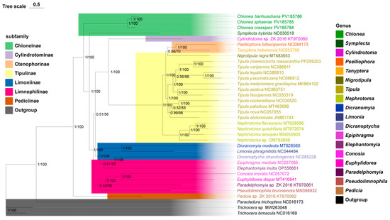 ML and BI trees for all Tipulomorpha were constructed using 13 PCGs. Different subfamilies and genera are color-coded, while the three outgroup species are grouped under a single color. The GenBank accession numbers for each species are provided following their respective names.