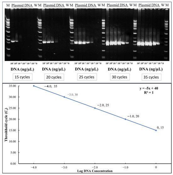 Gel electrophoresis of PCR products of serially diluted plasmid DNA at different cycles and standard curve: threshold cycles(Ct) vs. log DNA concentration (y = −5x + 40). The values shown represent the log-transformed DNA concentration with conversions as follows: Log −4.0 = 0.0001 ng/μL; Log −3.0 = 0.001 ng/μL; Log −2.0 = 0.01 ng/μL; Log −1.0 = 0.1 ng/μL; Log 0.0 = 1 ng/μL.