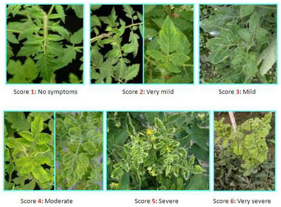 The plants were phenotypically evaluated and scored based on the severity of the disease symptoms using a 1–6 scale as shown in Figure 2.