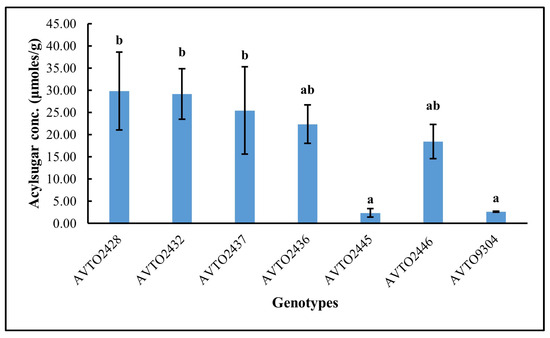 Total acylsugar concentration (μmoles/g) across genotypes. Different letters indicate statistical differences according to Dunn’s post hoc tests (p < 0.05). Error bars represent standard deviation.