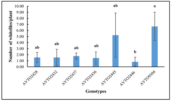Average number of adult whiteflies per plant across genotypes. Different letters indicate statistical differences according to Tukey’s HSD test (p < 0.05). Error bars represent standard deviation.