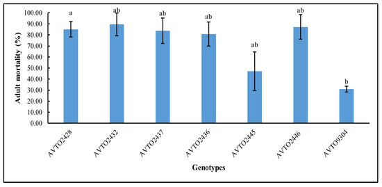 Percentage of adult whitefly mortality in different plant genotypes. Different letters indicate statistical differences according to Tukey’s HSD test (p < 0.05). Error bars represent standard deviation.
