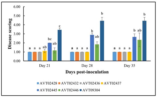 Figure 7 summarizes the disease scoring results. The multi-disease and insect-resistant plants consistently showed lower disease scores and none to very mild symptoms. At 35 dpi, the effectiveness of multi-disease and insect-resistant plants is demonstrated by an average severity rating of 1, indicating that all plants were healthy. In contrast, single-resistant plants and the susceptible check had average severity ratings of 2.50 and 4.44, respectively. At 35 dpi, all four lines differed significantly in disease severity from AVTO2445 and AVTO9304.