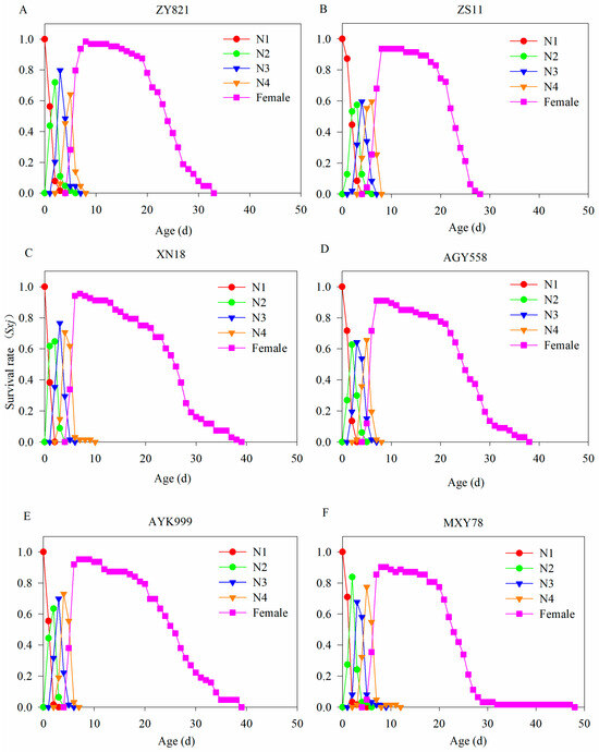 The age-stage survival rate of M. persicae feeding on different B. napus cultivars. (A–F) The survival rate of M. persicae after feeding on ZY821, ZS11, XN18, AGY558, AYK999, and MXY78, respectively. N1, N2, N3, N4, and females represent the first–fourth instar nymphs and female stage of M. persicae.