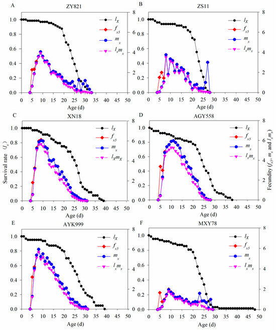 Population survival rate and fecundity of M. persicae feeding on different B. napus cultivars. lx represents population survival rate; fx5 represents female fecundity; mx represents population fecundity; and lxmx represents population maternity. (A–F) Population survival rate and fecundity of M. persicae after feeding on ZY821, ZS11, XN18, AGY558, AYK999, and MXY78, respectively.