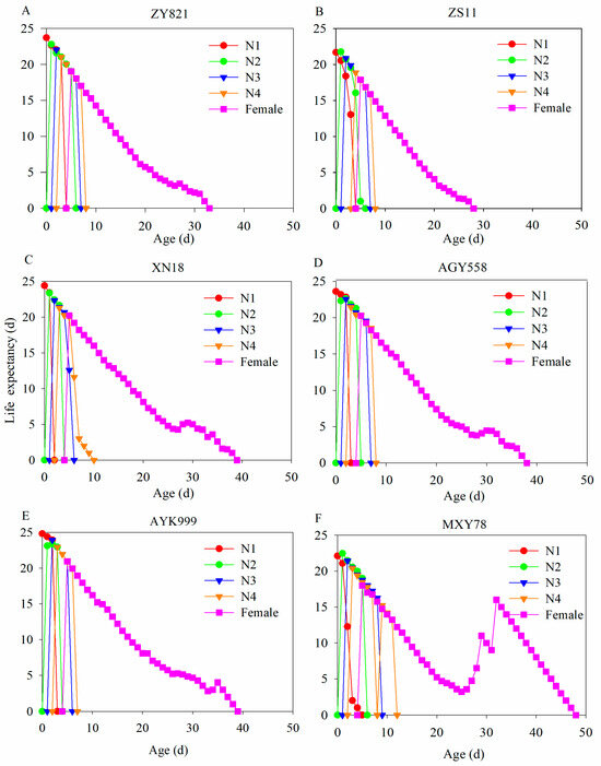 Life expectancy of M. persicae in each developmental stage feeding on different B. napus cultivars. (A–F) The life expectancy of M. persicae after feeding on ZY821, ZS11, XN18, AGY558, AYK999, and MXY78, respectively. N1, N2, N3, N4, and female represent first–fourth instar nymphs and female stages of M. persicae.