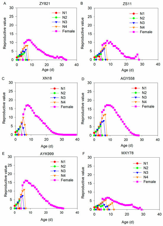 Reproductive value of M. persicae in each developmental stage feeding on different B. napus cultivars. (A–F) The reproductive value of M. persicae after feeding on ZY821, ZS11, XN18, AGY558, AYK999, and MXY78, respectively. N1, N2, N3, N4, and female represent first–fourth instar nymphs and female stages of M. persicae.