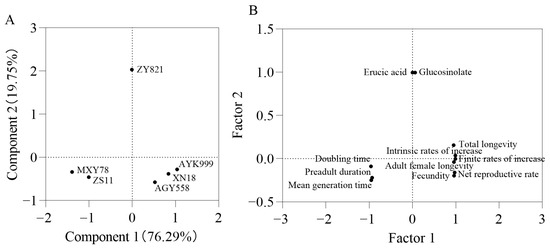 Principal component analysis (PCA) for different B. napus cultivars based on two substance contents in Brassica napus seeds and nine M. persicae population indexes. (A) PC scores of six rapeseed cultivars. (B) Loading plot was each index of M. persicae and erucic acid and glucosinolate content in six B. napus seeds. The factors included erucic acid: erucic acid content (%), glucosinolate: glucosinolate (µmol/g/rapeseed cake), doubling time, preadult duration (d), mean generation time (d), total longevity (d), intrinsic rates of increase (d), finite rates of increase (d), adult female longevity (d), fecundity (d), and net reproductive rate.