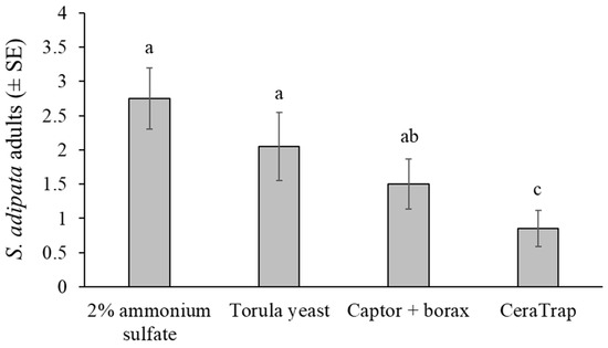 Under laboratory cage conditions, adult S. adipata flies were captured in similar numbers by traps baited with the 2% ammonium sulfate solution and torula yeast pellets. Both attractants were significantly more effective than CeraTrap, whereas Captor + borax yielded intermediate capture rates.