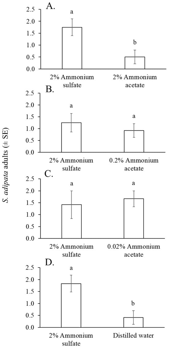 Mean number of S. adipata flies per trap per day captured in traps baited with solutions of 2% ammonium sulfate and 2% ammonium acetate (A), 0.2% ammonium acetate (B), 0.02% ammonium acetate (C), and distilled water (D). Columns labeled with different letters differed significantly (paired t-test, p < 0.05).