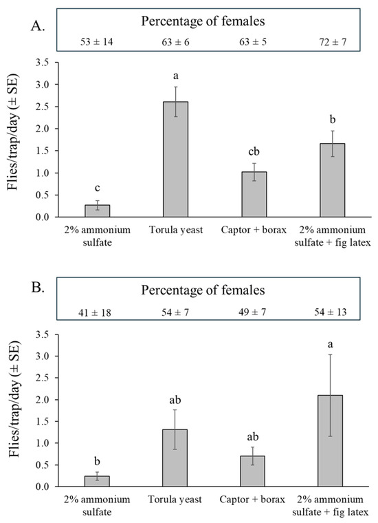 Mean (±SE) S. adipata flies per trap per day (FTD) captured in traps baited with different attractants in fig orchard 1 (dry season) (A), and fig orchard 2 (rainy season) (B). Columns labeled with different letters differ significantly (GLM, Bonferroni, p < 0.05). Boxes above graphs indicate the mean (±SE) percentages of females captured by each attractant in both experiments. The percentage of females captured did not vary significantly in either experiment (GLM, Bonferroni, p > 0.05).
