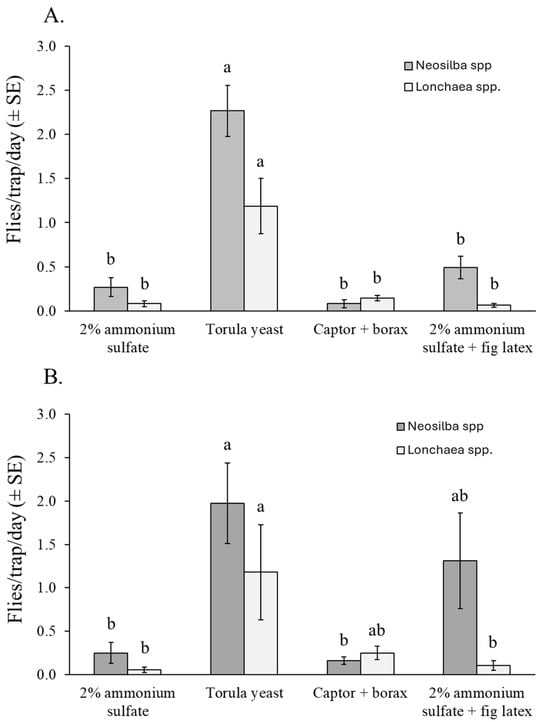 Mean captures of Neosilba spp. and Lonchaea spp. flies per trap per day (FTD) (both sexes) in traps baited with different attractants in fig orchard 1 (A) and fig orchard 2 (B). FTD values labeled with different letters differ significantly for Neosilba and Lonchaea (GLM, Bonferroni, p < 0.05).