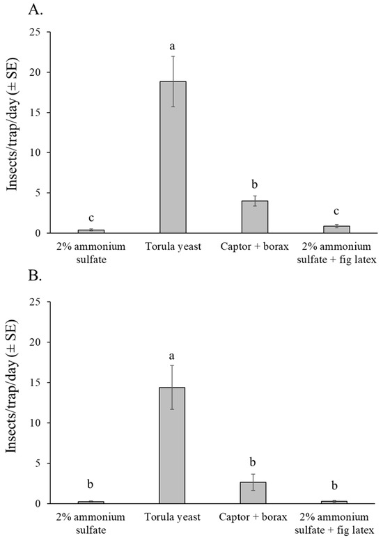 Mean number of insects per trap per day (excluding lonchaeid flies) captured in traps baited with different attractants in the fig orchard 1 (dry season) (A), and fig orchard 2 (rainy season) (B). Columns labeled with different letters differ significantly (GLM, Bonferroni, p < 0.05).