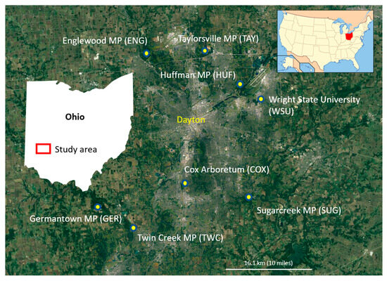 Study sites in the Miami Valley region of Southwest Ohio with site abbreviations. The upper left inset map shows the location of Ohio within the U.S.A. (red), and the left inset map shows the location of the study area within Ohio (red rectangle).