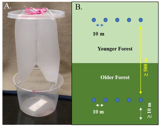At each site, we hung five flight intercept traps in both older and younger forest stands, for a total of 10 traps per site (80 traps total). The traps were placed in a straight line, 10 m apart, as much as terrain allowed (Figure 2B) and a minimum of 10 m from the edge of the forest to reduce possible edge effects (the only site in which traps were less than 30 m from the forest edge was the Huffman MP young woods plot, in which the closest trap was ca. 15 m from the forest edge). The old and young sampling locations at Cox Arboretum were the closest in proximity (ca. 500 m apart); however, in the other parks, the distance between paired sampling locations was at least 1 km. This distance was chosen to maximize impendence of samples in young and old forest plots while still sampling in the same forested area and general community.