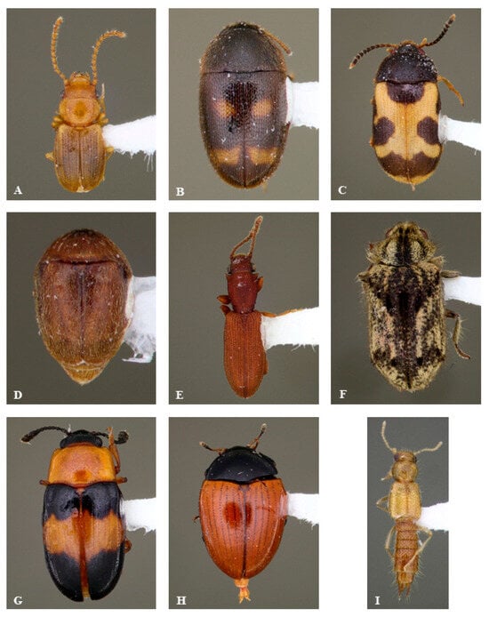- Hanley, R.S.; Goodrich, M.A. Review of mycophagy, host relationships and behavior in the new world Oxyporinae (Coleoptera: Staphylinidae). Coleopt. Bull. 1995, 49, 267–280. [Google Scholar]