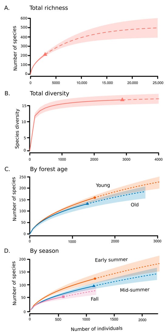 Species accumulation curves for total beetle species (A) and total effective species (B) by forest age (C) and by sampling period (D). Shapes indicate totals observed, solid lines indicate rarefaction curves, and colored regions indicate approximate 95% confidence intervals. Dotted lines are extrapolations to approximate saturation in (A,B) and to double the sample size in (C,D). Note: Scale of x and y axes varies among panels.