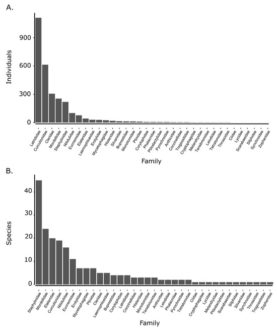 Total abundance (A) and richness (B) by beetle family, ordered from highest to lowest, across all traps and sampling periods.