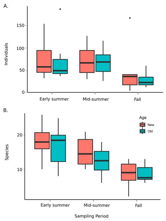 The optimal model to explain variation in beetle abundance included age, season, and honeysuckle as fixed effects, with park as a random effect. Beetle abundance significantly declined over the season (F2,36 = 13.074, p < 0.0001; Figure 6A) and with increasing honeysuckle basal area (F1,38 = 8.163, p = 0.007), but age did not have a statistically significant effect (F1,38 = 1.477, p = 0.232; Table 3). Although beetle abundance was generally lower with increasing honeysuckle invasion, the significance of this relationship was driven by the fall sampling period (Figure 7A). Coarse woody debris did not significantly affect beetle abundance and was not included in the final model. The extent of honeysuckle invasion varied widely among sampling sites (Table S1; F7,64 = 6.234, p < 0.001); however, overall, it was greater in young forest stands (when nested within site (F8,64 = 7.927, p < 0.001)).