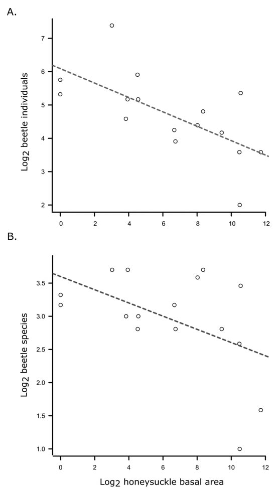 Linear regressions of beetle abundance (A) and richness (B) against invasive honeysuckle abundance (log2 (basal area + 1)) during the fall sampling period. Abundance: F1,14 = 11.01, p = 0.005, adj. R2 = 0.40; richness: F1,14 = 4.51, p = 0.053, adj. R2 = 0.19).