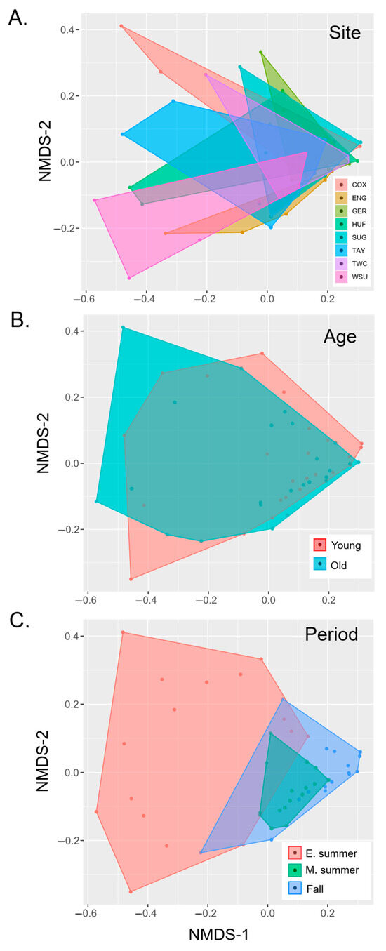 NMDS ordination for samples grouped by (A) site, (B) age class, and (C) sampling period (early summer, mid-summer, and fall). Colored dots represent samples, and shapes represent convex hulls relative to grouping factor.