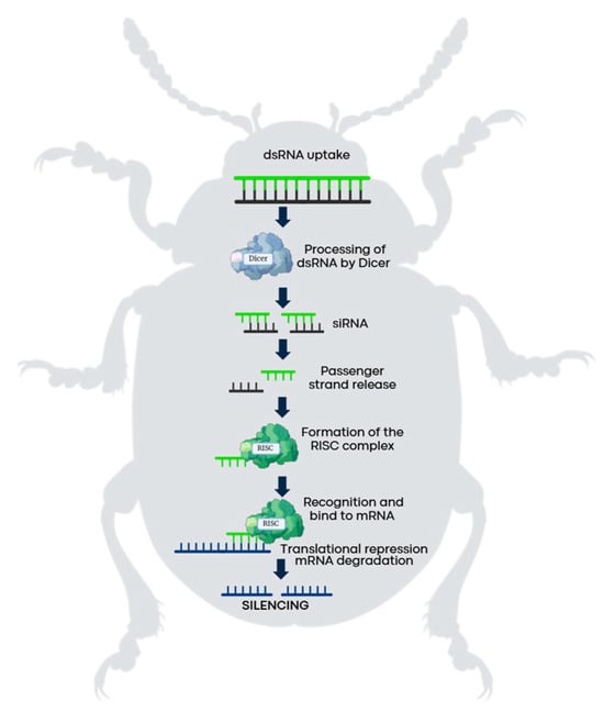 RNAi is a regulatory mechanism of gene expression that acts through the selective degradation of specific messenger RNAs (mRNA) [17,18], thereby preventing the production of encoded proteins [19]. The process is triggered by the presence of dsRNA molecules in the cell, which are recognized by a ribonuclease III-type enzyme, Dicer-2. This enzyme cleaves the dsRNA into small fragments of approximately 21–25 nucleotides in length, typically bearing 2-nucleotide 3′ overhangs on each strand. These fragments are known as small interfering RNAs (siRNAs) [20,21,22,23]. The resulting siRNAs are subsequently incorporated into the RNA-induced silencing complex (RISC), where the Argonaute-2 protein facilitates the sequence-specific cleavage of complementary mRNA targets [20,24] (Figure 1).