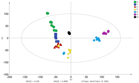 Principal component analysis of metabolome samples at different developmental stages of A. pernyi pupae. Note: CK—diapause period of A. pernyi pupae (deep diapause state with arrested development and minimal metabolic activity); T1—early development stage of A. pernyi pupae; T2—mid-early development stage of A. pernyi pupae; T3—mid-stage of A. pernyi pupae; T4—mid-late stage of A. pernyi pupae; T5—late stage of A. pernyi pupae; QC—All samples mixed equally. “R2×[1] and R2×[2] denote the proportion of variance explained by the 1st and 2nd principal components (PC1 and PC2) in the PCA.