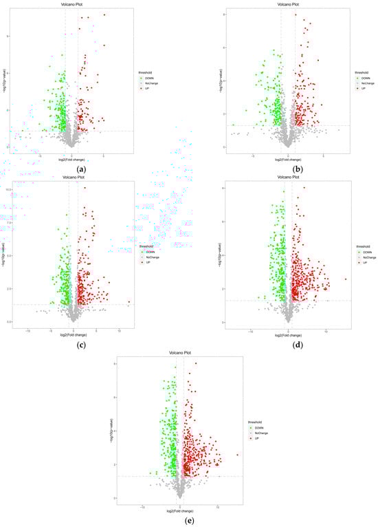 Volcano plots of differential metabolites in A. pernyi pupae at different developmental stages ((a): T1 vs. CK; (b): T2 vs. CK; (c): T3 vs. CK; (d): T4 vs. CK; (e): T5 vs. CK). Note: The two vertical dotted lines represent the log2 (fold change) thresholds (e.g., set as ±1 in this analysis). Genes with log2 (fold change) > 1 (right of the right—hand dotted line) are labeled as up—regulated (red dots), and those with log2 (fold change) < −1 (left of the left—hand dotted line) are down—regulated (green dots). Dots between the lines show no significant fold change.