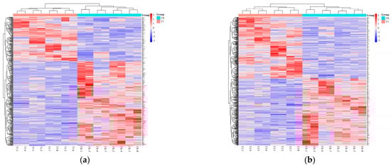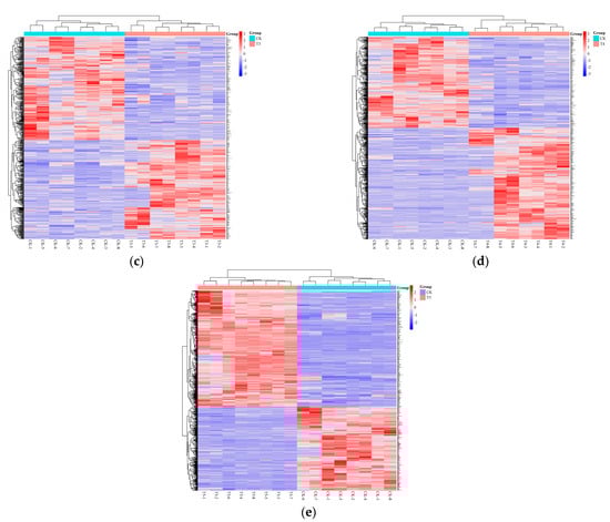 Hierarchical clustering analysis of differential metabolites at different developmental stages of A. pernyi pupa ((a): T1 vs. CK; (b): T2 vs. CK; (c): T3 vs. CK; (d): T4 vs. CK; (e): T5 vs. CK). The original figures are available in the Supplementary Materials.
