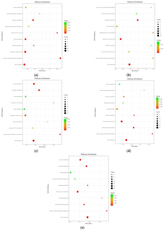 Bubble diagram of KEGG metabolism pathway of A. pernyi pupae’s differential metabolites (Top 10) ((a): T1 vs. CK; (b): T2 vs. CK; (c): T3 vs. CK; (d): T4 vs. CK; (e): T5 vs. CK). Note: Abscissa represents the degree of enrichment; ordinate represents the pathway name of the top 10; color of the point represents the p-value; size of the point represents the number of different metabolites enriched.